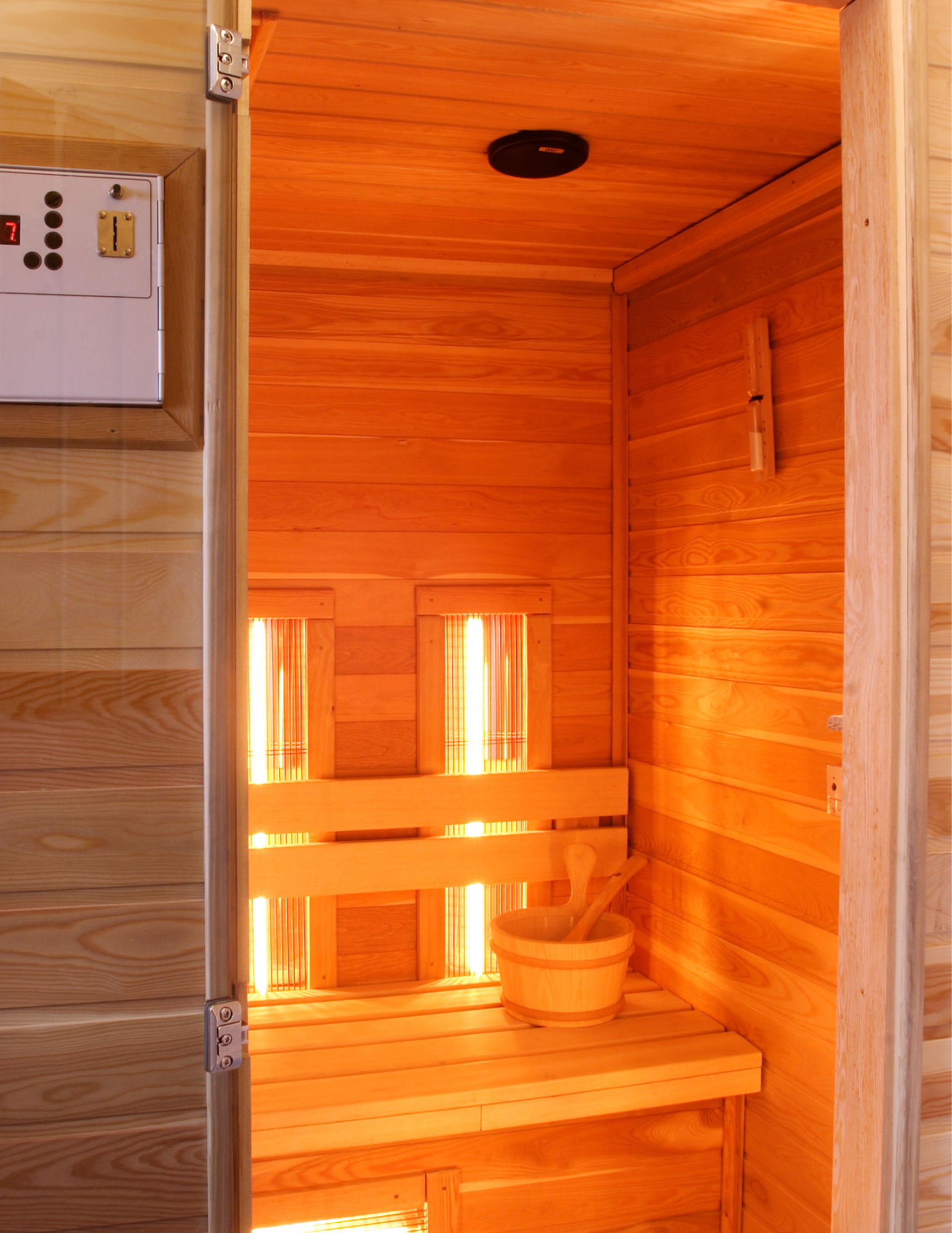 The sauna includes chromotherapy (color light therapy), which uses the vibrational energy of light to support healing